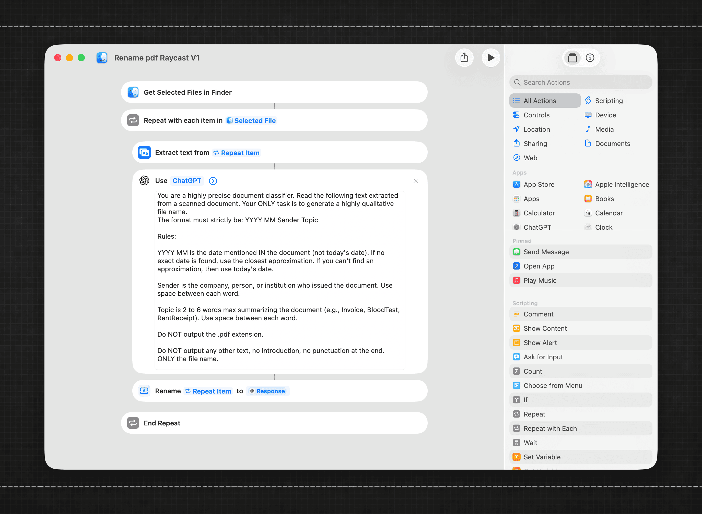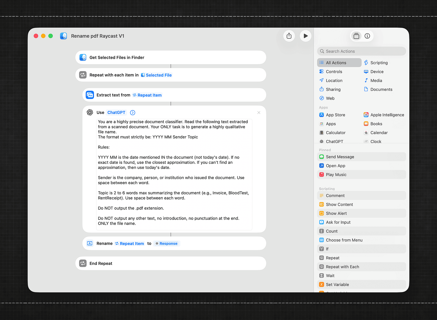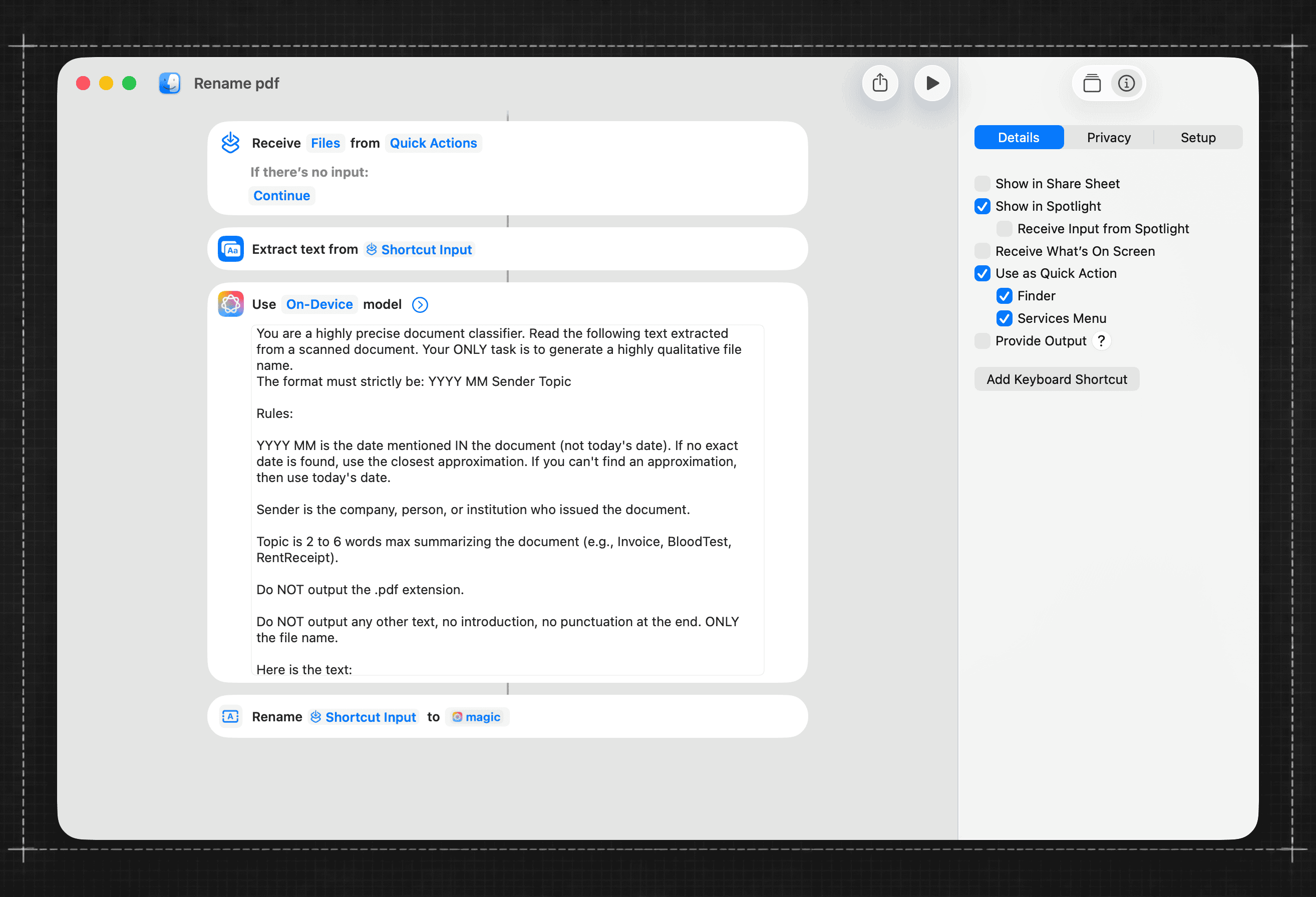 Select a PDF, run the shortcut, and the document gets renamed automatically.